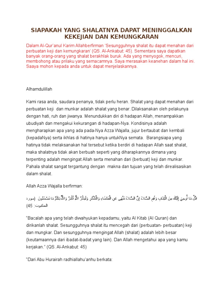 Yang terpenting terus melakukannya dan menjaganya menurut cara seperti ini maka shalat yang dilakukannya itu dapat mencegah dari perbuatan keji dan mungkar. Salah satu contoh dari amar maruf adalah menjalankan sholat lima waktu. Perbuatan keji dan munkar adalah dua istilah yang disebutkan di dalam al quran. Keji dan munkar ini sama sama menunjuk pada perilau tercela namun pengertiannya berbeda. Al fahsya dalam tafsir depag ri diartikan dengan perbuatan keji. Perbuatan keji dalam bahasa arab disebut fahisyah arab.