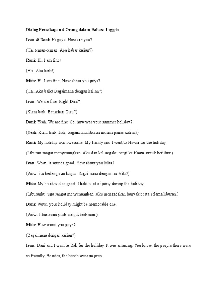 85 percakapan bahasa indonesia singkat 2 orang. Contoh teks percakapan bahasa inggris tentang liburan ini ditulis untuk sobat sobit semua yang sedang mengerjakan tugas bahasa inggris tentang liburan holiday. Continue reading percakapan bahasa. Nah nantinya coba anda kenali apa saja hal yang identik dengan saat saat liburan di pantai. Seperti halnya tugas membuat percakapan bahasa inggris lainnya tugas sekolah ini biasanya menjadi tugas kelompok minimal dua orang. Percakapan yang berlangsung akan menyesuaikan dari jumlah orang yang ada pada dialog.
