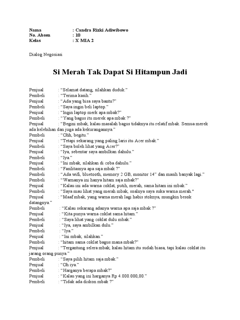 Jakarta 12 januari 2014. Ini adalah salah satu contoh teks drama negosiasi untuk 5 orang terbaik yang bisa kami posting dan bisa menjadi pelajaran yang sangat berguna sekali karena cerita contoh teks drama negosiasi untuk 5 orang ini sangat menyentuh hati kocak dan sangat menyenangkan sekali saat dipentaskan dengan teman teman nantinya. Ran pr bahasa indonesia kamu sudah kamu kerjakan belum. Literasi negosiasi macam teks negosiasi pengertian teks negosiasi percakapan 5 orang tentang jual beli percakapan penjual dan pembeli di toko sebutkan struktur teks negosiasi struktur teks negosiasi teks dialog negosiasi 4 orang lucu. Contoh teks negosiasi berbagai kasus. Koja bahari kawasan pelabuhan tanjung priok jakarta utara.