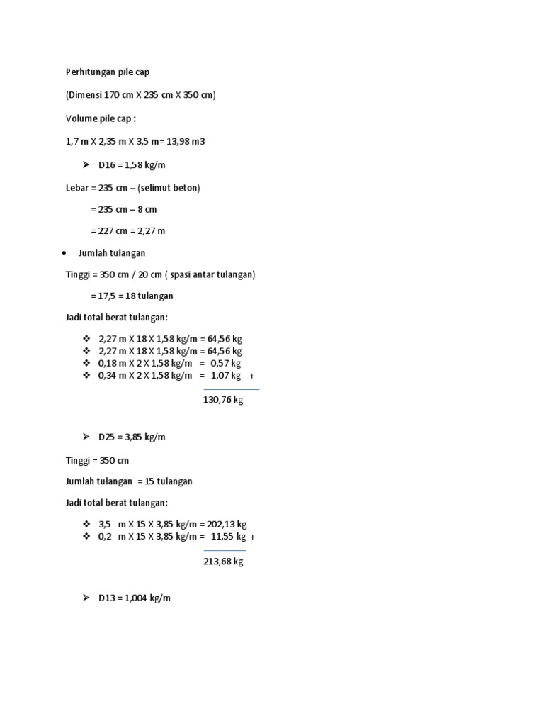 Perhitungan pile cap tipe pc 1 155 x 155 x 70 cm panjang pile cap 155 m lebar pile cap 155 m tinggi pile cap 07 m jumlah 40 buah pile cap decking beton 5 cm kait 6 d 48 asep kurniawan 2014 studi evaluasi perubahan volume rencana universitas pendidikan indonesia repositoryupiedu perpustakaanupiedu 07 063. Berikut perhitungan tulangan pada pekerjaan pile cap. Hal ini adalah asumsi yang salah. Volume pile cap pile cap perhitungan volume bekisting pada pekerjaan pile cap perhitungan volume beton pada pekerjaan pile cap perhitungan volume tulangan pada. Dalam pelaksanaan pekerjaan struktur bangunan terkadang perlu dilakukan perhitungan konversi besi tulangan konvensional ke besi wiremes. Digunakan tulangan d22 150 as 25342.