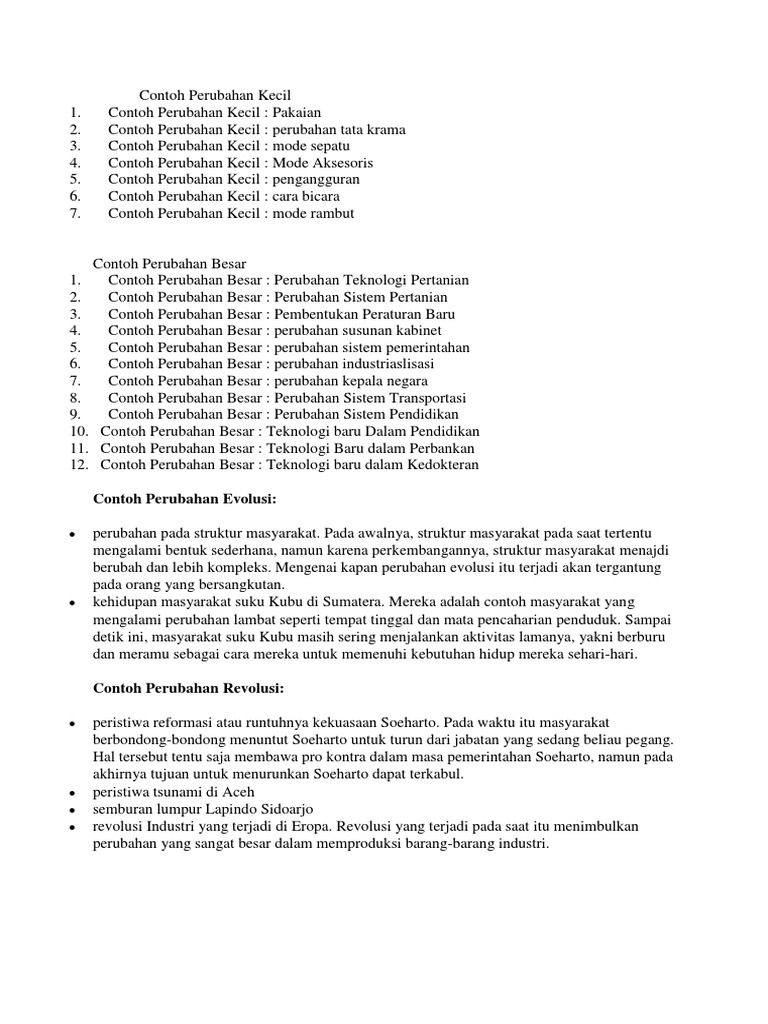 Perubahan kecil dan besar serta contohnya perubahan kecil dan besar memiliki batas batas yang sangat relatif. Bentuk perubahan ini terjadi dalam unsur struktur sosial yang tidak memberi pengaruh langsung. Berikut diberikan beberapa diantaranya yaitu. Satu periode yang kemudian di indonesia sangat sedikit wanita ke luar rumah tanpa kerudung. Perubahan sosial progress. Contoh perubahan sosial besar adalah pergeseran dari masyarakat agraris ke masyarakat industri.