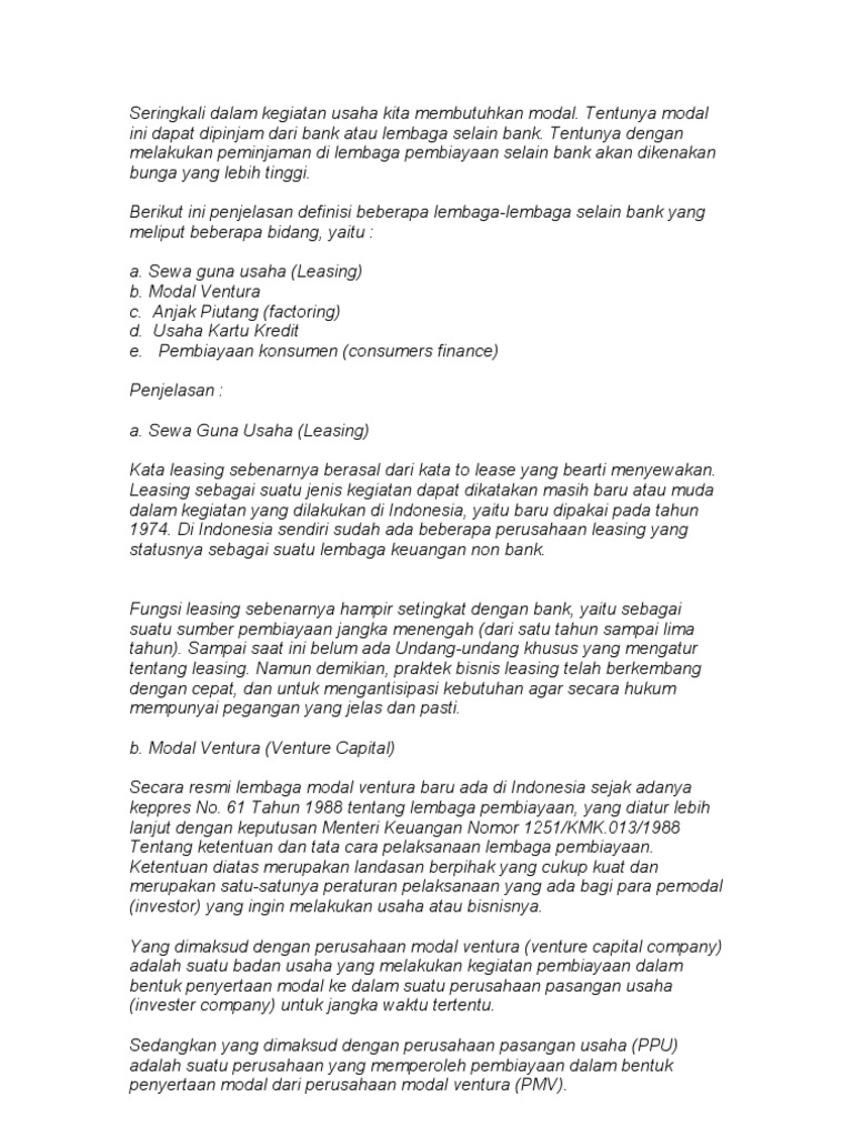 Kontrak modal ventura merupakan dokumen hukum utama main legal document yang dibuat dan berfungsi secara sah bagi perusahaan modal ventura dan perusahaan pasangan usaha dengan memenuhi syarat syarat sebagaimana yang ditetapkan dalam pasal 1320 kuh perdata. Ada banyak cara mendirikan perusahaan perseorangan termasuk dalam mendirikan perusahaan modal ventura. Kontrak modal ventura merupakan dokumen hukum utama main legal document yang dibuat dan berfungsi secara sah bagi perusahaan modal ventura dan perusahaan pasangan usaha dengan memenuhi syarat syarat sebagaimana yang ditetapkan dalam pasal 1320 kuh perdata. Keputusan ini dibuat dengan berbagai pertimbangan tentunya dan hal ini sesuai pula dengan maksud dan tujuan didirikannya perusahaan modal ventura yaitu melakukan penanaman modal dalam suatu usaha yang mengandung resiko tinggi. Perusahaan modal ventura menghimpun dana dan mengelola dana yang diinvestasikan dalam bentuk penyertaan modal pada perusahaan pasangan usaha.