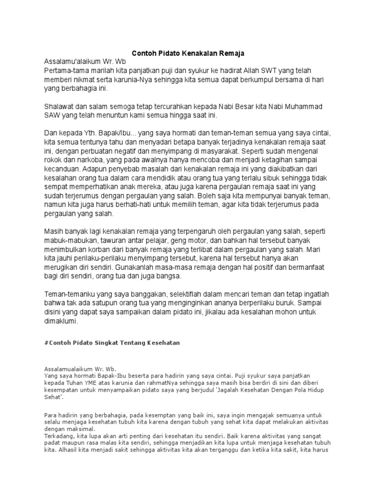Contoh pidato singkat tentang kenakalan remaja. Pidato singkat tentang kenakalan remaja solusi penyelesaian kerangka lengkap hallo sahabat pembaca semua yang budiman pada kesempatan kali ini kita akan membahas makalah tentang pidato singkat tentang kenakalan remaja solusi penyelesaian kerangka lengkappidato biasanya disampaikan di depan umum dengan membawa teks pidato. Text 1 good morning everyone firstly let. Teman teman yang saya cintai. Seperti halnya pidato lainnya contoh pidato singkat kali ini juga mengandung fungsi kata baku contoh paragraf pembuka contoh paragraf penutup contoh kalimat pernyataan dalam bahasa indonesia dan contoh kalimat dan paragraf persuasi. Artikel makalah tentang pidato tentang kenakalan remaja meliputi dari pengertian tujuan manfaat penyebab sikap teks contoh dan gambar suoaya mudah di pahami. Contoh pidato tentang kenakalan remaja.