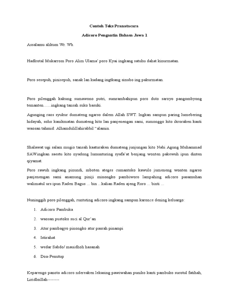 Teks pranatacara kesripahan teks pranatacara dinas teks pranatacara pepanggihan teks pranatacara pasamuan teks pranatacara pengaosan pentas dan lain sebagainya. Contoh pidato bahasa jawa tentang pendidikan assalamualaikum wr. Semoga dapat membantu tugas sobat semuanya. Contoh teks pranatacara adicoro pengantin bahasa jawa pada kesempatan kali ini saya akan memberikan contoh teks mc untuk acara pranatacara adicoro pengantin dalam bahasa jawa yang baik dan benar. Langkung rumiyin monggolah kita sesarengan ngunjukaken takwa. Kritik karya seni rupa pengertian jenis bentuk tahapan fungsi penggolongan hukum berdasarkan sumber bentuk tempat berlaku waktu berlaku cara mempertahankan sifat wujud dan isi.