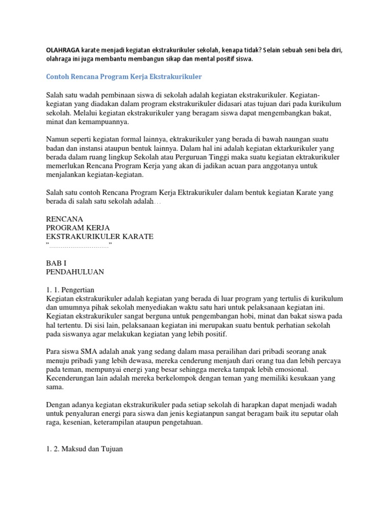 Contoh program kerja ekstrakurikuler olahraga. Demikianlah gambaran rencana program kerja ini kami susun dengan harapan akan menjadi acuan dalam melaksanakan langkah langkah kegiatan ekstrakurikuler karate sehingga perkembangan kegiatan ini akan lebih jelas dan terarah dalam pencapaian tujuan dengan di sertai bantuan oleh pihak pihak yang terkait baik secara langsung maupun tidak langsung semoga rencana kegiatan ini akan dapat terlaksana. Tercapainya program kerja olahraga tahun pelajaran 20172018 di smpn 2 sukagumiwang kabupaten indramayu. Menumbuhkan daya tanggal pada diri siswa terhadap pengaruh negatif memantapkan kegiatan ekstrakurikuler dalam menunjang pencapaian kurikulum. Puji dan syukur kita panjatkan kehadirat alloh swt yang telah memberikan taofik dan hidayah nya sehingga kami dapat menyelesaikan buku program kerja kegiatan ekstrakurikuler olahraga. Contoh program kerja ekstrakurikuler olahraga bola voli untuk smp ini mungkin bermanfaat juga bagi anda yang membutuhkan referensi lainnya yang berhubungan dengan contoh program kerja ekstrakurikuler olahraga seperti program kerja ekstrakurikuler sepak bola contoh program kerja ekstrakurikuler futsal program ekskul bola voli sd contoh proposal kegiatan ekstrakurikuler olahraga contoh. Berkas ini mudah mudahan berguna sebagai referensi ditujukan untuk guru olahraga kepala sekolah di smp atau pihak lainnya yang memerlukan.