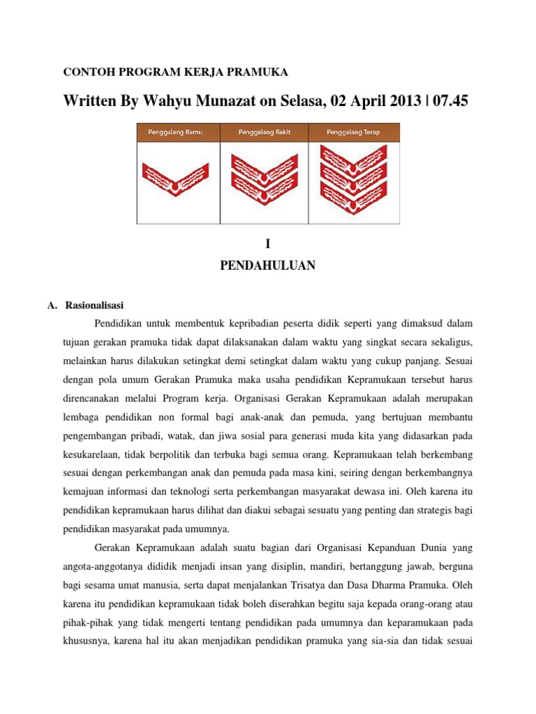 Contoh program kerja pramuka. Demikian program kerja gugus depan pangkalan smp negeri 3 saketi tersusun dengan harapan dapat menjadi acuan bagi gerak dan kerja pramuka di gugus depan. Program kerja gugusdepan pramuka penggalang menjadi sebuah administrasi yang selayaknya disusun oleh gudep setiap tahunnya. Materi latihan yang diberikan pada anggota pramuka adalah materi yang tercantum dalam program kerja tahunan gugus depan 01008 01009 gunung djati smp merah putih. Tentunya program kerja gugusdepan pramuka setelah disusun oleh pembina gugusdepan harus mendapat persetujuan dari kepala. Disamping itu program kerja ini diharapkan dapat menjadi pedoman bagi sekolah dalam menentukan kebijakan yang berhubungan dengan kegiatan kepramukaan pada smp negeri 3 saketi. Organisasi gerakan kepramukaan adalah merupakan lembaga pendidikan non formal bagi anak anak dan pemuda yang bertujuan membantu pengembangan pribadi watak dan jiwa sosial para generasi muda kita yang didasarkan pada kesukarelaan tidak berpolitik dan terbuka bagi.