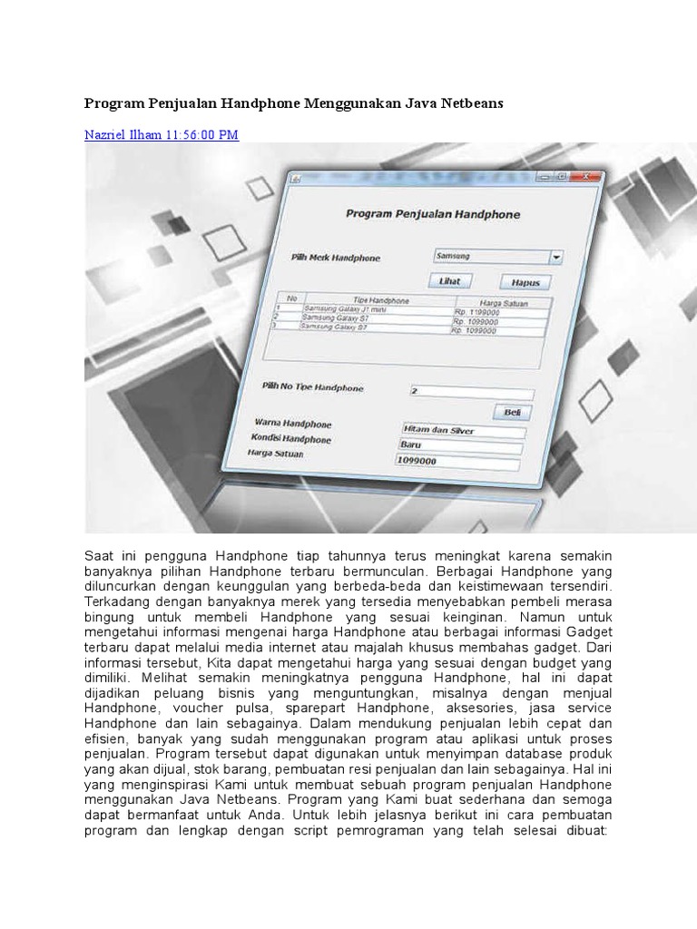 Untuk lebih jelasnya berikut ini cara pembuatan program dan lengkap dengan script pemrograman yang telah selesai dibuat. Dalam pembuatan aplikasi ini tentunya membutuhkan beberapa tools diantaranya. Membuat aplikasi penjualan mobil menggunakan java netbeans ketika kita membuat penjualan dan berhubungan dengan database maka pastinya tidak lepas dari yang namanya server dan saya disini memakai server mysql gratis yaitu xampp phpmyadmin untuk menyimpan databasenya. Program sederhana rental mobil cara gampang menambahkan icon title di aplikasi netbeans. Aplikasi ini dibuat untuk mempermudah dalam mengelola transaksi barang elektronik selian itu aplikasi penjualan elektronik ini dibuat dengan berbasis desktop. Dan saya menggunakan perintah for untuk melakukan perulangan pada saat menampung data yang diinput dan menampilkannya kembali.