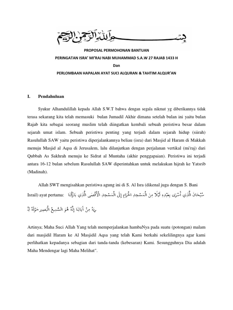 Harapan kami agar kegiatan ini mampu menjadi motivasi dan inspirasi. Proposal isra miraj 2017. Permohonan bantuan dana di tempat assalamualaikum warohmatullohi. 1 satu bundel yth. Demikian proposal kegiatan isra miraj nabi muhammad saw ini kami buat. Oleh sebab itu sebagai salah satu wujud cinta kami kepada allah swt dan nabi muhammad saw kami ikatan remaja masjid al ashri akan melaksanakan peringatan isra miraj untuk memperingati bahwa luar bi a sanya nabi muhammad saw dalam memperjuangkan agama islam serta menyambut bulan suci ramadhankegiatan ini merupakan salah satu program kerja irma al ashri yang dapat kami jadikan sebagai.