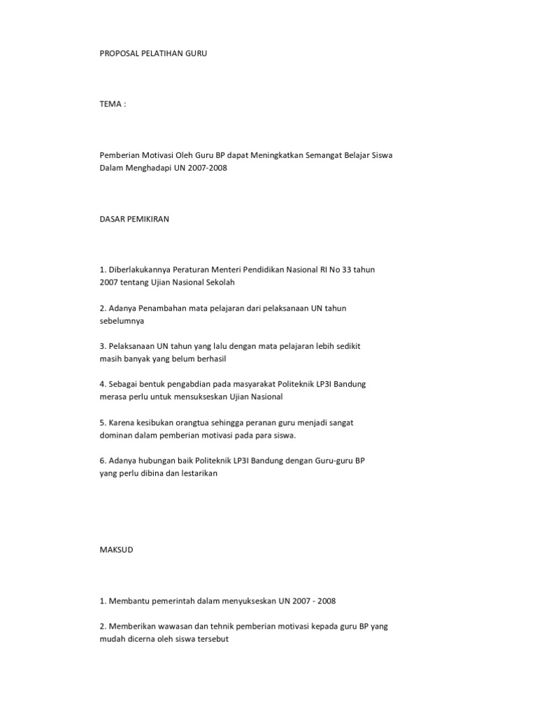 Demikian proposal ini kami buat sebagai gambaran bagi pelaksanaan pelatihan dan peningkatan mutu tenaga pendidik atau guru di kabupaten kutai kartanegara. Demikian proposal ini kami buat sebagai gambaran bagi pelaksanaan pelatihan peningkatan mutu tenaga pendidik di lingkungan gugus 27 kec. Berbagai pelatihan untuk meningkatkan kompetensi guru sudah dilakukan termasuk pelatihan mengajar yang disesuaikan dengan perkembangan zaman seperti pemanfaatan teknologi. Semoga apa yang kita lakukan senantiasa mendapt lindungan dari allah swt serta anak didik kita menjadi generasi bangsa yang mampu mengharumkan negara. Peningkatkan sarana belajar mengajar juga menjadi faktor penting dalam peningkatan kompetensi guru. Tujuan kegiatan pelatihan ini adalah sebagai upaya untuk meningkatkan mutu pendidikan dan menciptakan tenaga pendidik yang profesional.