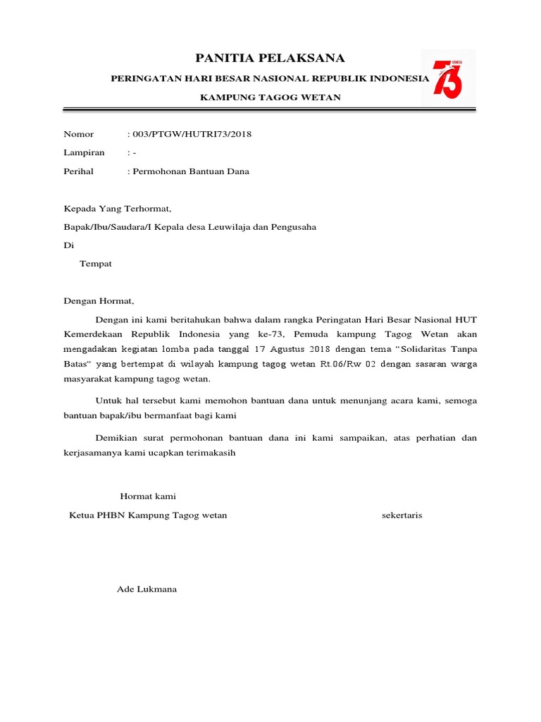 Pendahuluan sebagai salah satu tujuan wisata di kota bandung teras cihampelas memiliki daya tarik yang sangat kuat baik bagi pembeli maupun penjual. Untuk mengatasi masalah sumber dana ini dapat dilakukan dengan iuran antaranggota. Agar permohonan tersebut dikabulkan ada saatnya kamu akan meminta atau memohon bantuan kepada orang lain dan biasanya harus mengajukan surat permohonan. Sebuah lingkungan pendidikan akan berjalan dengan baik apabila dilaksanakan dengan manajemen yang baik. Panitia acara hut republik indonesia kompleks tangerang indah vi tangerang selatan kop surat lembaga atau organisasi. Nah saat kamu akan magang ke suatu perusahaan atau instansi tentu saja tidak bisa langsung menyampaikanmaksud secara lisan.