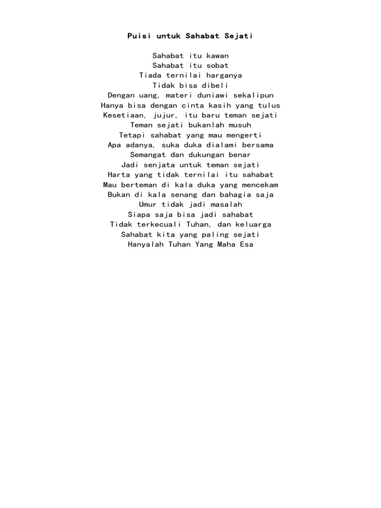Puisi sahabat istilah sahabat sering digunakan untuk menggambarkan tentang dekatnya dan menandakan adanya hubungan relationship yang sangat kental atau sohib dalam kamus gaulnya. Bermacam cara orang mengungkapkan makna puisi sahabat dan contohnya biasanya selalu diungkapkan degan. Sahabat tidak sekedar istilah sahabat biasanya teman perjalanan atau teman sepermainan atau teman sebaya. Kumpulan puisi persahabatan sejati puisi persahabatan. Kompilasi puisi persahabatan terbaru terbaik yang melukiskan indahnya makna persahabatan sejati dalam hidup ini. Oleh sebab itu sahabat seringkali dijadikan tema dalam suatu karya sastra termasuk puisi.
