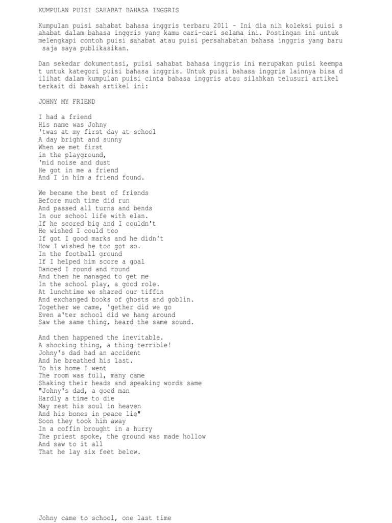 Puisi sahabat istilah sahabat sering digunakan untuk menggambarkan tentang dekatnya dan menandakan adanya hubungan relationship yang sangat kental atau sohib dalam kamus gaulnya. Puisi pendek tantang cinta sontak setiap hendak menulis sajak sketsa wajahmu itu selalu saja merebak udara menjadi sesak penaku henti mendadak serangkaian. Sangat sulit mendapatkan orang yang benar benar bisa menjadi sahabat anda. Puisi anak pada contoh puisi anak anak umumnya lebih simpel dari puisi orang dewasa karena pada dasarnya anak anak menulis puisi hanya berdasarkan apa yang ia senangi saja dan apa yang ia rasakan. Oleh sebab itu sahabat seringkali dijadikan tema dalam suatu karya sastra termasuk puisi. Kumpulan contoh puisi persahabatan terbaik di sekolah pendidikan perpisahan.