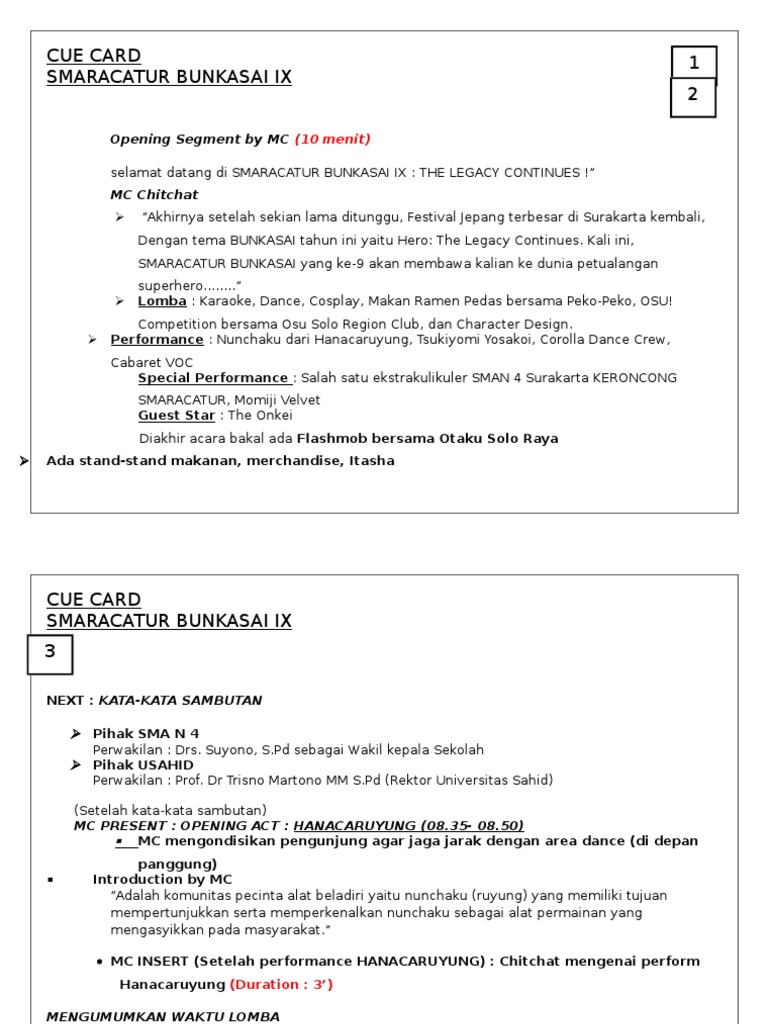 Contoh q card mc. Tapi karena sudah tugas ya mau tidak mau jadi terpaksa belajar. Kaget dan grogi sih udah jelas. Cue card sebagian orang menyebutnya que card ini tidak hanya berguna bagi mc tetapi juga bagi moderator atau public speaker untuk mencatat poin poin penting yang akan disampaikan ketika berbicara. Ketika tes ielts bahkan kita akan diminta membuat cue card sebelum melakukan long speech selama 1 sd 2 menit di tes speaking part 2. Pembukaan opening atau membuka acara merupakan salah satu tugas pokok pembawa acara atau master of ceremony. Contoh teks naskah pembukaan oleh pembawa acara mc.