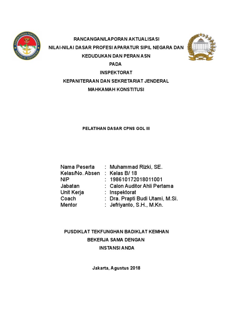 Rancangan aktualisasi nilai nilai dasar pns golongan iii. Menyusun rancangan aktualisasi ini. Contoh format rancangan aktualisasi prajabatan cpns di bpsdm selasa 05 maret 2019 1 comment edit aktualisasi adalah suatu kegiatan yang dilaksanakan di bpsdm badan pengembangan sumber daya manusia atau bpsdmd didaerah masing masing instansi. Kumpulan pengetahuan terkait dunia pendidikan baik itu pendidikan di sekolah sd smp sma kuliah pendidikan di rumah dan masyarakat. Drsjoko kumoromsi sebagai mentor penulis yang telah banyak membantu dalam memberikan saran dan masukan mengenai perkiraan program kegiatan dalam pelaksanaan rancangan aktualisasi di instansi nanti. Contoh rancangan aktualisasi cpns kata pengantar puji syukur penulis panjatkan ke hadirat tuhan yang maha kuasa yang telah melimpahkan rahmat dan karunia nya sehingga penulis dapat menyelesaikan rancangan aktualisasi nilai nilai dasar asn di dinas penataan ruang kota makassar provinsi sulawesi selatan guna memenuhi salah satu syarat.