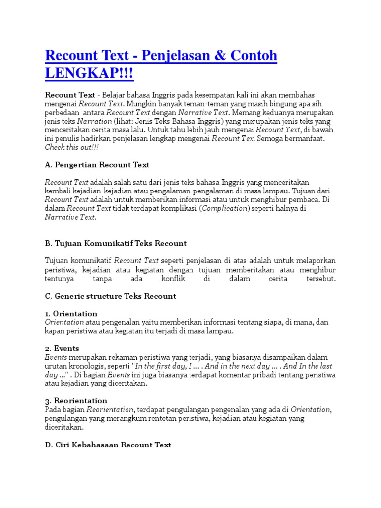 Contoh recount text tentang pengalaman pribadi. Berikut ini kami sajikan beberapa contoh recount text pendek tentang pengalaman pribadi. Personal recount adalah recount text yang berfungsi menceritakan tentang pengalaman pribadi penulis. Contoh text recount di bawah terdiri dari beberapa contoh. Hujan baru saja reda satu jam sebelumnya. Contoh recount text tentang pengalaman tak terlupakan berenang di sungai. Macam macam jenis recount text bisa dilihat di bawah ini.