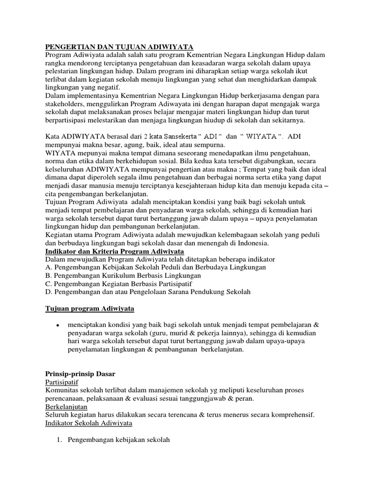 Contoh rencana program adiwiyata sekolah lengkapadi memiliki arti yaitu besar agung baik ideal dan sempurna sedangkan wiyata memiliki arti tempat dimana seorang mendapat ilmu pengetahuan norma dan etika dalam berkehidupan sosial. Program adiwiyata merupakan program penting untuk di tindak lanjuti dibahas secara spesifik dan digarap dengan baik dimana seluruh kegiatan dilakukan secara berencana dan terus menerus secara komperensif agar terciptanya kondisi yang baik bagi sekolah untuk menjadi tempat pembelajaran dan penyadaran warga sekolah sehingga di kemudian hari warga sekolah tersebut dapat turut bertanggung jawab.