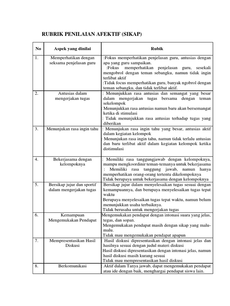Contoh rubrik penilaian afektif. Rubrik penilaian kognitif afektif psikomotor lembar penilaian kognitif tujuan. Teknik penskoran untuk penilaian ranah afektif dapat dilakukan secara sederhana. Dalam kamus besar bahasa indonesia afektif adalah berkenaan dengan rasa takut atau cinta mempengaruhi keadaan perasaan dan emosi serta mempunyai gaya atau makna yang menunjukkan perasaan. Rubrik penilaian sikap mapel ipa kd 31 menggali informasi dari teks laporan hasil pengamatan tentang gaya gerak energi panas bunyi dan cahaya dengan bantuan guru dan teman dalam bahasa indonesia lisan dan tulis dengan memilih dan memilah kosakata baku. Pengertian afektif dan penilaian afektif afektif atau sikap merupakan suatu kecendrungan tingkah laku untuk berbuat sesuatu dengan cara metode teknik dan pola tertentu terhadap dunia sekitarnya. Orang yang tidak memiliki minat pada pelajaran tertentu sulit untu.