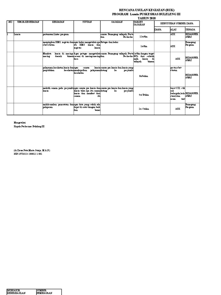 Tersusunnya rencana usulan kegiatan ruk puskesmas untuk tahun berikutnya dalam upaya mengatasi masalah atau sebagian masalah kesehatan masyarakat. Selanjutnya ruk tersebut akan diajukan ke dkk dan dibahas di dewan setelah di berikan anggaran jika sudah jadi maka menjadi rpk rencana pelaksanaan kegiatan. Biar tidak bingung ini contoh pengisian rencana usulan kegiatan puskesmas bisa langsung sedot saja biar ga bingung. Contoh ruk puskesmas harapan 2017. Rencana rencana ini tentu saja seharusnya berada dalam perencanaan puskesmas ruk dan rpk agar bila dalam rencana ini dibutuhkan anggaran minimal tahun depan realisasi anggaran untuk rencana rencana ini bisa terwujud. Untuk mencapai tujuan tersebut diselenggarakan program pembangunan nasional secara berkelanjutan.