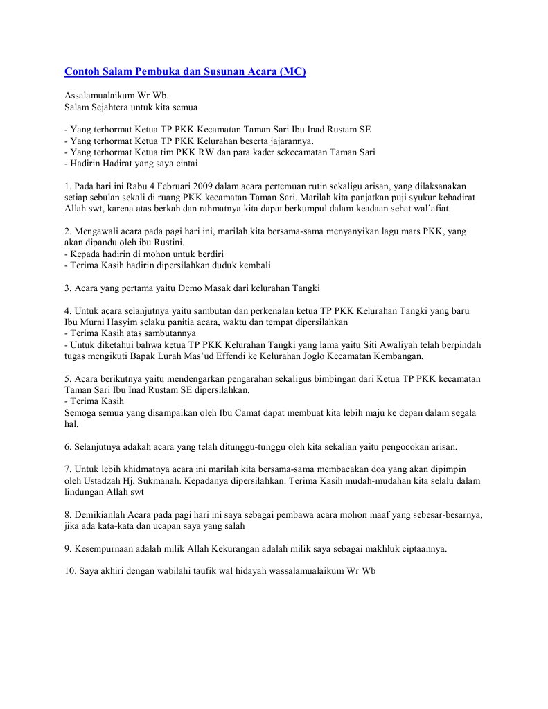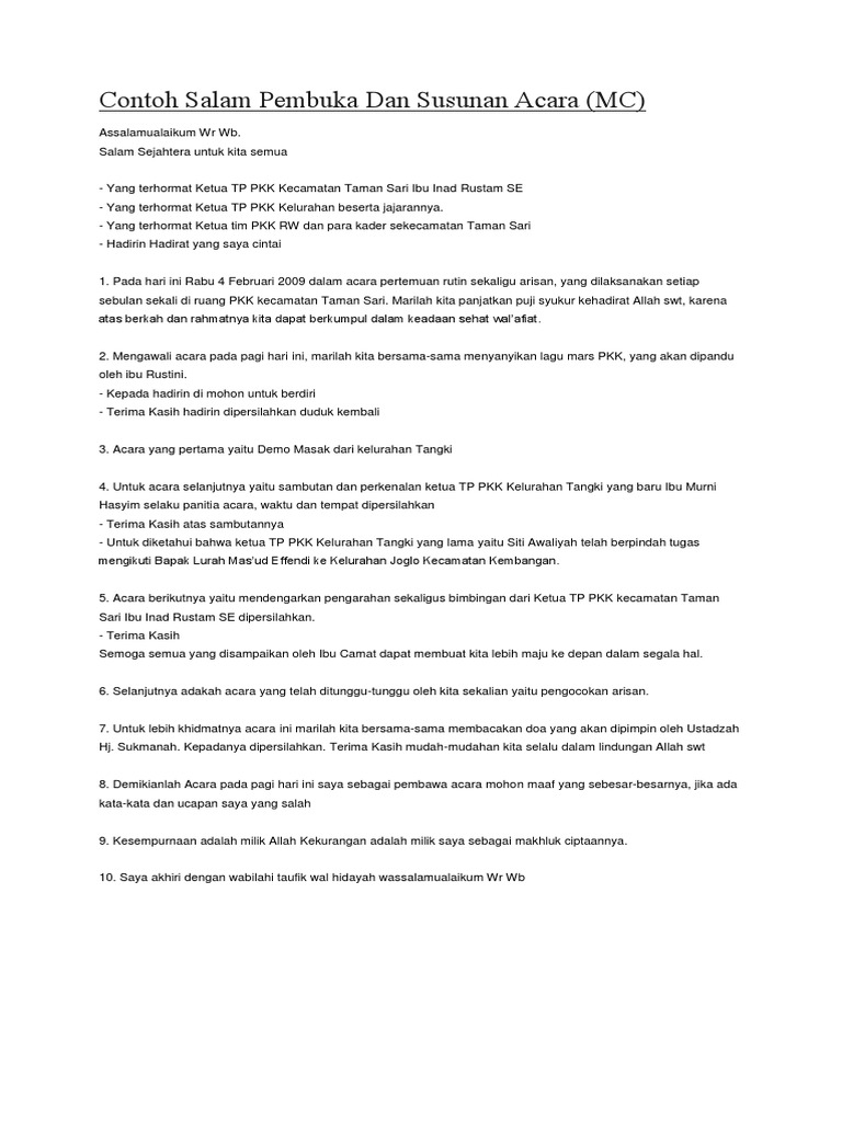 Contoh salam pembuka dan susunan acara mc acara yang pertama yaitu demo masak dari kelurahan tangki contoh salam pembuka dan susunan acara mc untuk acara selanjutnya yaitu sambutan dan perkenalan ketua tp pkk kelurahan tangki yang baru ibu murni hasyim selaku panitia acara waktu dan tempat dipersilahkan. Selamat pagi dan salam sejahtera bagi kita semua. Nah artikel contoh teks mc kali ini adalah naskah mc yang secara khusus untuk jenis acara formal atau acara yang sifatnya resmi.