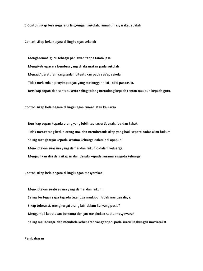 Sikap positif warga negara dalam bela negara di lingkungan. Sebelum kemerdekaan setelah kemerdekaan 2. Contoh contoh upaya bela negara. Baca juga identitas nasional. Mengajar di depan kelas secara profesional adalah suatu bentuk bela negara. Bela negara merupakan sebuah tekad sikap tindakan dan perilaku warga negara yang dilakukan dengan teratur menyeluruh dan juga terpadu yang dijiwai dan didasari oleh kecintaan kepada nkri berdasarkan pancasila dan uud 1945 dalam menjamin kelangsungan hidup bangsa dan juga negara.