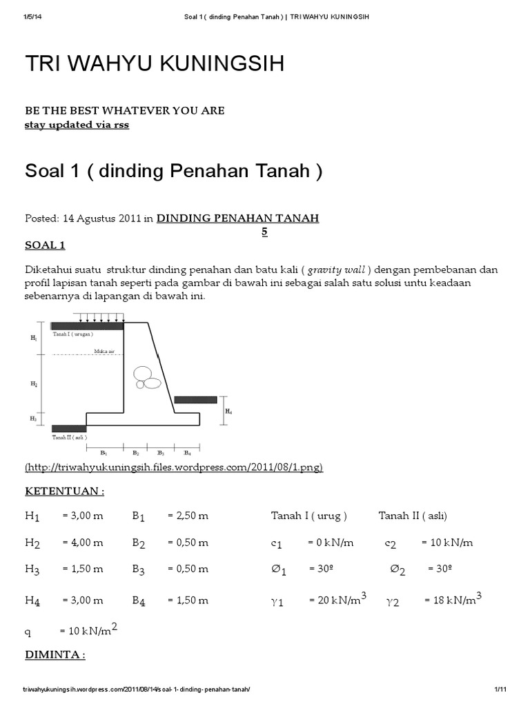 Contoh soal dinding penahan tanah. Berat sendiri struktur dan berat tanah yang berada di atas pelat fondasi. Postingan ini merupakan part 1 dari perancangan struktur dinding penahan tanah kantilever part ke 2 akan membahas tentang cara menghitung kebutuhan tulangan dinding penahan tanah tipe kantilever yang sudah dihitung disini. Contoh tanah yang tidak terganggu undisturb sample yaitu contoh tanah yang mempuyai sifat sifat aslinya sesuai dengan kondisi tanah di tempat pengambilan contoh tanah. Dinding penahan tanah 51. Soal 1 diketahui suatu struktur dinding penahan dan batu kali gravity wall dengan pembebanan dan profil lapisan tanah seperti pada gambar di bawah ini sebagai salah satu solusi untu keadaan sebenarnya di lapangan di bawah ini. Besar dan distribusi tekanan tanah pada dinding penahan tanah sangat tergantung pada gerakan tanah lateral terhadap dpt.