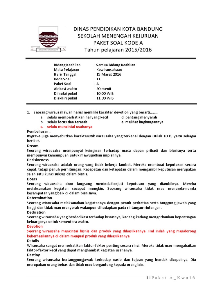 Soal kewirausahaan kelas x soal dan jawaban kewirausahaan kelas x semester 2 soal uas kewirausahaan kelas x beserta jawabannya contoh soal kelas x kewirausahaan smasmk semester genap temuan solusi mengenai keyword awal kalimat diartikel ini 20 soal kewirausahaan kelas x uas ada diartikel ini dan untuk pembahasan materi soal ini membahas seputar istilah kwu sikap dan apa saja yang. Manfaatkan waktu sebaik baiknya jawaban. Enggan kerja lembur e.