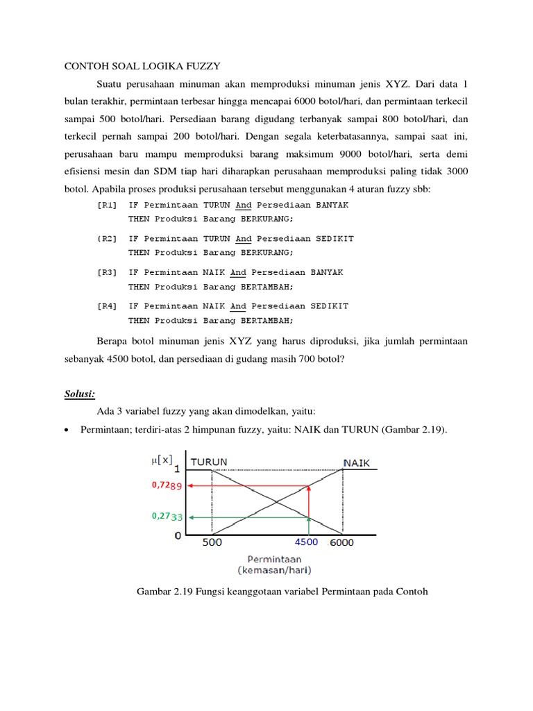 Contoh soal logika fuzzy. Unknown senin 16 juni 2014 pada postingan kali ini saya akan share cara menyelesaikan sebuah permasalahan produksi menggunakan metode tsukamoto pada bab fuzzy logic. Yuuuk kita lihat contoh soal berikut. Namunsekali seseorang mulai mengenalnya ia pasti akan sangat tertarik dan akanmenjadi. Derajat keanggotaan sebagai hasil dari operasi dua buah himpunan fuzzy disebut sebagai fire strength atau α predikat. Module fuzzy sugeno orde nol b. Berikut ini merupakan contoh aplikasi pemrograman logika fuzzy untuk sistem pengatur kecepatan mesin menggunakan sensor suhu dan sensor cahaya sebagai masukan.