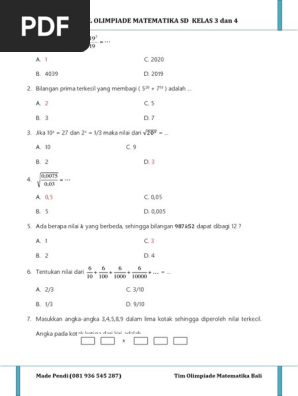 Contoh soal olimpiade matematika. Osn sd adalah satu acara bergengsi untuk membuktikan prestasi siswa sekolah dasar. Berbagai lomba tingkat sekolah menengah atas seperti olimpiade sains provinsi maupun nasional osp dan osn tentunya perlu persiapan yang matang baik dari segi pembelajaran materi terlebih lagi dalam belajar variasi dan pola pola pertanyaan pada matematika. Perlu diingat bahwa cara menjawab yang diberikan hanyalah alternatif saja selaku gurupembimbing anda dapat menyesuaikan dengan kemampuan siswa. Mulai dari latihan soal olimpiade matematika tingkat kabupaten tingkat provinsi hingga tingkat nasional. Dengan adanya bank soal diharapkan siswai maupun guru dan pengajar mendapat lebih banyak referensi serta bahan latihan untuk menghadapi. Teori atau trik dalam mengerjakan pertanyaan olimpiade harus disiapkan secara bertahap dengan segala upaya untuk mengerjakan.