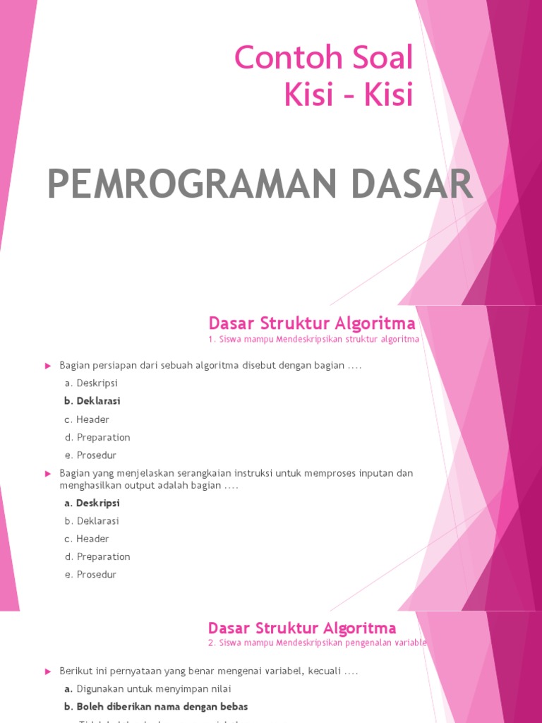 Mebandingkan kesamaan dua nilai d. Server yang dapat membuat sistem berbasis unix seperti linux untuk melakukan sharing rresource dengan sistem berbasis windows. Soal pemrograman dasar tkj kelas xi 1. Pseudocode yang di gunakan pada penulisan algoritma berupa pada pembuatan program komputer algoritma dibuat. Conroh soal dan jawaban uts pemrograman dasar kelas x semester 1 dan 2 dalam menyusun suatu programlangkah pertama yang harus di lakkukan adalah sebuah prosedur langkah demi langkah yang pasti untuk menyelesaikan sebuah masalah di sebut. Operator merupakan simbol yang biasa dilibatkan dalam program untuk melakukan suatu operasi atau manipulasi berikut yang bukan merupakan penggunaan operator adalah a.