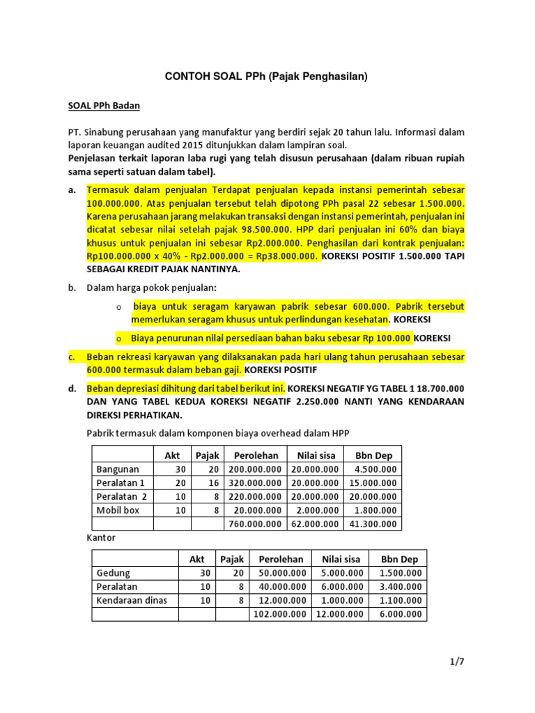 Contoh soal pph badan dan jawabannya. Pertama badan usaha yang memiliki pendapatan bruto sampai rp48 miliar per tahun atau sering disebut usaha mikro kecil dan menengah umkm berdasarkan peraturan pemerintah nomor 23 tahun 2018 dikenakan tarif pajak pph final yaitu pph pasal 4 ayat 2 dengan perhitungan pajak 05 dikalikan dengan seluruh pendapatan bruto dari hasil usaha. Soal ini diberikan oleh dosen perpajakan unswagati cirebon pada saat kuis dan uas hari ini jumat 10012014. 4800000000 sekarang saya akan sharing contoh menghitung pph wp badan yang peredaran brutonya di atas 4800000000 sd 50000000000 untuk wajib pajak yang sesuai dengan kriteria ini maka perhitungan pajaknya sesuai dengan yang berlaku umum sesuai dengan pasal 17 ayat 1 huruf b. Admin blog contoh soal terbaru 2019 juga mengumpulkan gambar gambar lainnya terkait contoh soal pph badan dan koreksi fiskal beserta jawabannya dibawah ini. Contoh soal pph. 7500000 dan menurut fiscal sebesar rp.