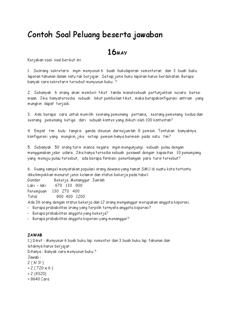 Contoh soal tentang peluang. Contoh soal peluang 1 pada percobaan melempar sebuah mata uang logam sebanyak 120 kali ternyata muncul angka sebanyak 50 kali. Hal hal mendasar yang harus dipahami dalam mempelajari peluang misalnya aturan perkalian permutasi kombinasi dan pemecahannya serta menentukan sampel peluang kejadian dan menafsirkannya. Jadi peluang yang akan terambilnya kelereng putih dari kantong pertama dan kelereng hitam dari kantong kedua ialah 38 x 610 1880 940 jawaban. Demikianlah artikel dari pengajarcoid tentang contoh soal peluang dan pembahasannya semoga bermanfaat. Soal pembahasan matematika sd smp sma. 1 sebuah dadu dilempar sekali tentukan peluang munculnya mata dadu 6.