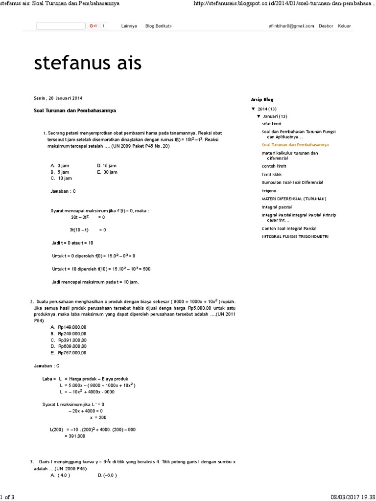 Contoh soal turunan dan pembahasannya pdf. Contoh soal akuntansi dan juga pembahasannya kelas 12. Setelah sebelumnya kita membahas lengkap materi integral kali ini kita akan membahas contoh soal integral dengan menggunakan sifat sifat integral tentu dan tak tentusimak soal dan pembahasan berikut untuk meningkatkan pemahamanmu mengenai cara penyelesaian soal soal integral. Contoh soal dan pembahasan tentang turunan trigonometri. Soal aplikasi turunan trigonometri soal dan pembahasan turunan fungsi trigonometri pdf soal hots turunan trigonometri soal. Soal dan pembahasan turunan tingkat tinggi. Pembahasan rumus turunan fungsi aljabar bentuk ax n.