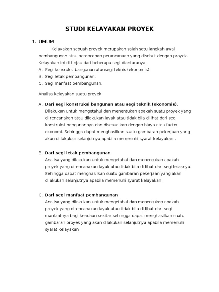 Tujuan dari studi kelayakan adalah untuk menilai kelayakan suatu gagasan usahaproyek. Studi kelayakan proyek skp merupakan salah satu mata kuliah pilihan bagi mahasiswa jurusan teknik sipil. Studi kelayakan bisnis merupakan penelitian terhadap rencana bisnis yang tidak hanya menganalisis layak atau tidak layak bisnis dibangun tetapi juga saat dioperasionalkan secara rutin dalam rangka pencapaian keuntungan yang maksimal untuk waktu yang tidak ditentukan. S tudi kelayakan menurut banyak definisi sangat beraneka ragam artinya tetapi inti dari suatu studi kelayakan yaitu ingin mengetahui layak tidaknya suatu kegiatan program proyek untuk diaksanakan. Academiaedu is a platform for academics to share research papers. Studi kelayakan proyek perumahan medina residence bintaro.