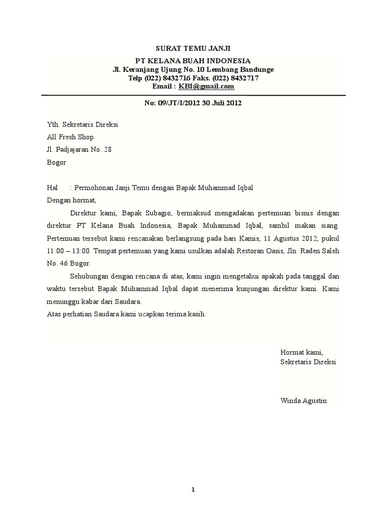 09jti2012 30 juli 2012 yth. Surat permohonan janji temu appointment contoh nomor. Pt kelana buah indonesia jl. Di dalamnya juga perlu mengutarakan maksud pertemuan secara singkat namun tetap jelas. Permohonan janji temu dengan bapak muhammad iqbal dengan hormat direktur kami bapak subagio bermaksud mengadakan. Contoh surat janji temu admin sampaikan contoh surat janji temu untuk anda yang ingin membuat contoh surat janji temu karena kami menyampaikan format contoh surat janji temu lengkap dan kami berikan dibawah supaya anda bisa men contoh surat janji temu ini.