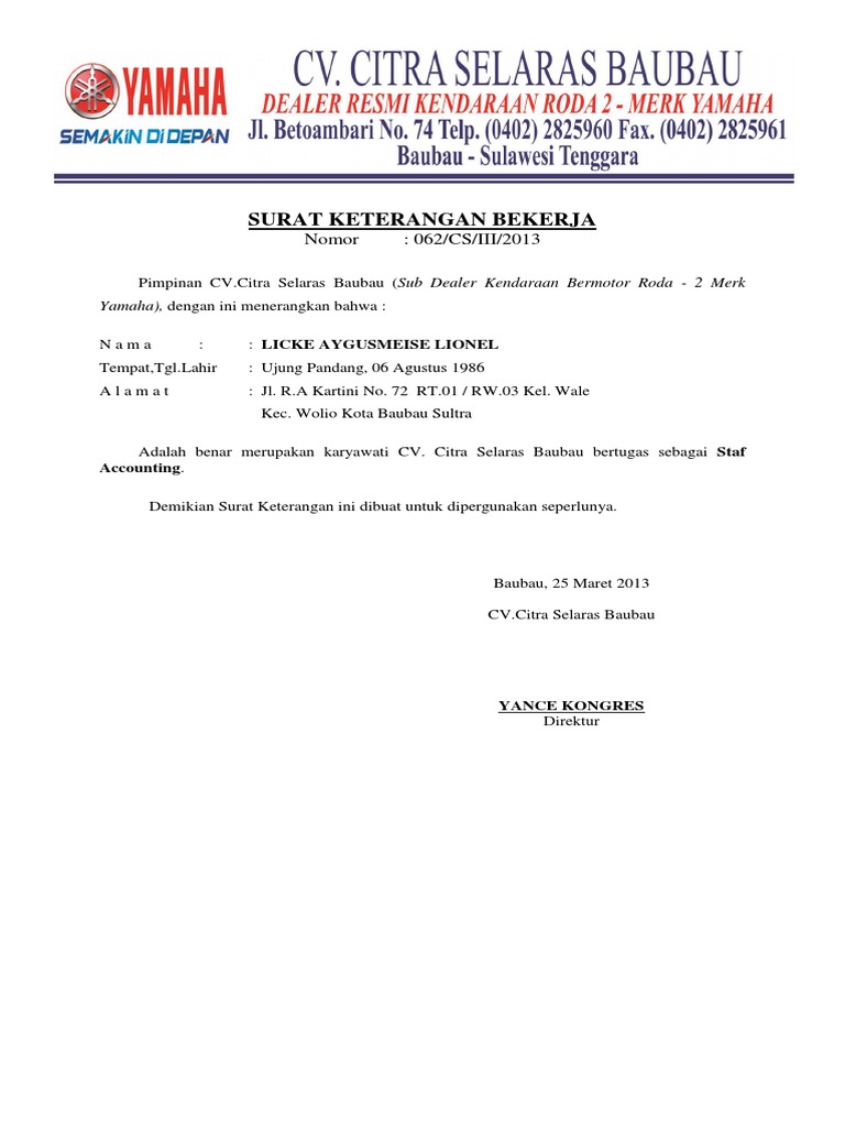Tempat tanggal lahir. Contoh surat keterangan kerja sebuah surat keterangan kerja sangatlah dibutuhkan untuk memberikan penjelasan kepada seseorang instansi maupun perusahaan tempat bekerja agar dapat menerangkan memberikan penjelasan tentang suatu hal yang terkait misalnya kecakapan prilaku maupun lama pengabdian. Surat keterangan belum bekerja biasanya digunakan untuk kalian yang ingin mendaftar pelatihan skkni di bprtik secara gratis. Contoh surat keterangan karyawan kembali lagi kami hari ini untuk memberikan sebuah contoh surat kepada anda anda sekalian dimana contoh surat yg pada kesempatan hari ini akan coba kami sajikan adalah contoh untuk surat keterangan karyawansurat keterangan karyawan sendiri sering juga disebut dengan surat keterangan kerja dimana surat ini menyatakan jika seseorang masih bekerja di lembaga. Contoh surat keterangan kerja untuk kamu yang sedang mencari informasi seputar cara membuat surat keterangan kerja atau contoh contoh surat keterangan kerja dari perusahaan baik itu untuk keperluan kuliah pembuatan atau pengajuan visa kamu berada di tempat yang tepat. Surat keterangan kerja setelah sebelumnya membahas contoh surat pernyataan pada ksesempatan ini akan saya ulas tentang surat keterangan beserta contoh contohnya.
