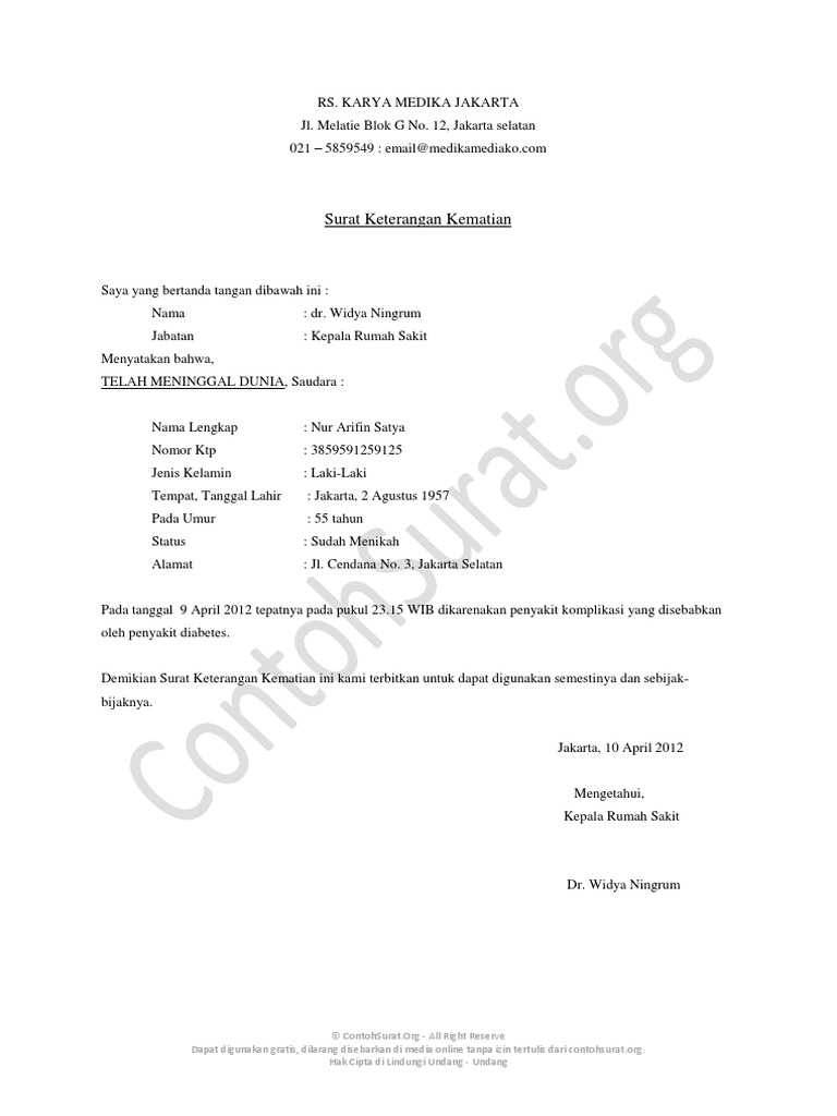 Contoh surat keterangan kematian 1 adalah surat keterangan kematian yang diterbitkan oleh pihak rumah sakit untuk keluarga yang ditinggalkan. Karena kali ini kami akan mengulas dan membagikan contoh format surat keterangan kematian doc word dan pdf secara gratis dan mudah di download. Jika benar anda datang di situs yang tepat. Contoh surat kematian surat kematian merupakan surat yang isinya menerangkan seseorang bahwa seseorang telah meninggal dunia. Contoh surat keterangan kematian 2 adalah surat keterangan kematian yang diterbitkan oleh dinas kependudukan dan catatas sipil disdukcapil yang biasa digunakan untuk mengajukan pencairan dana asuransi jiwa pembagian hak waris dl. Tapi jangan asal melaporkan kematian ya biasanya orang yang akan mencatatkan kematian dari seseorang tersebut adalah dari pihak keluarga.