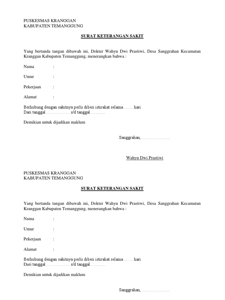 Contoh surat keterangan sakit dari puskesmas. Surat ini merupakan contoh dari surat resmi dimana penulisan dan penggunaan bahasa yang harus sesuai dengan ejaan yang disempurnakan. 15 contoh surat dokter untuk berbagai keperluan dalam berbagai hal dan urusan surat keterangan dari dokter sangatlah diperlukan. Jika anda sedang dalam kondisi sakit maka tentu anda akan berusaha pergi ke dokter ataupun berobat ke klinik dan puskesmas. Nah saat anda berobat ke salah satu rumah sakit maka anda bisa meminta surat keterangan sakit dari pihak rumah sakit sebagai bukti bahwa anda memang benar benar sakit. Contoh surat keterangan kematian 2 adalah surat keterangan kematian yang diterbitkan oleh dinas kependudukan dan catatas sipil disdukcapil yang biasa digunakan untuk mengajukan pencairan dana asuransi jiwa pembagian hak waris dl. Contoh surat keterangan sakit dari puskesmas.