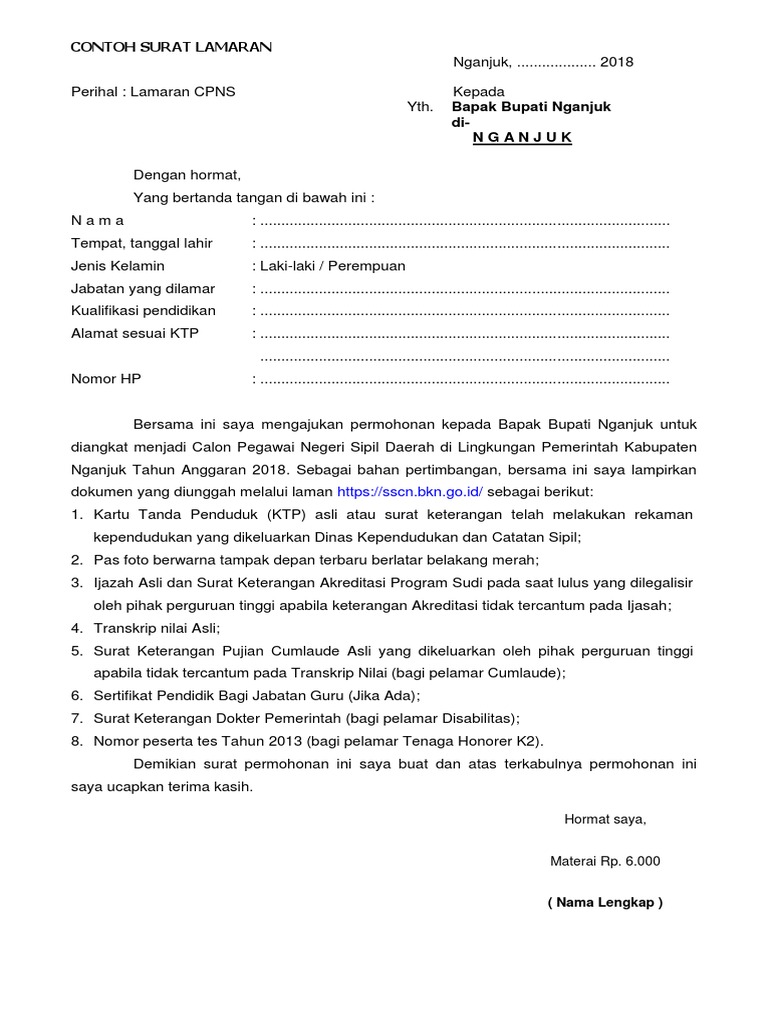 Tenaga kesehatan guru tenaga teknis pendaftaran calon pegawai negeri sipil atau cpns 2019 resmi dibuka 11 november 2019 lalu. Surat lamaran lebih ke arah penegasan soal identitas dan jabatan atau formasi yang akan dipilih pelamar di pendafataran cpns 2019. Tribun timurcom ini contoh surat lamaran cpns 2019 instansi kabupaten kota. Surat permohonan kepada bupati terdiri atas bagian pembuka isi dan penutup surat. Sebab tidak ada standar khusus dalam pembuatan surat lamaran yang ditetapkan oleh pemerintah pusat.
