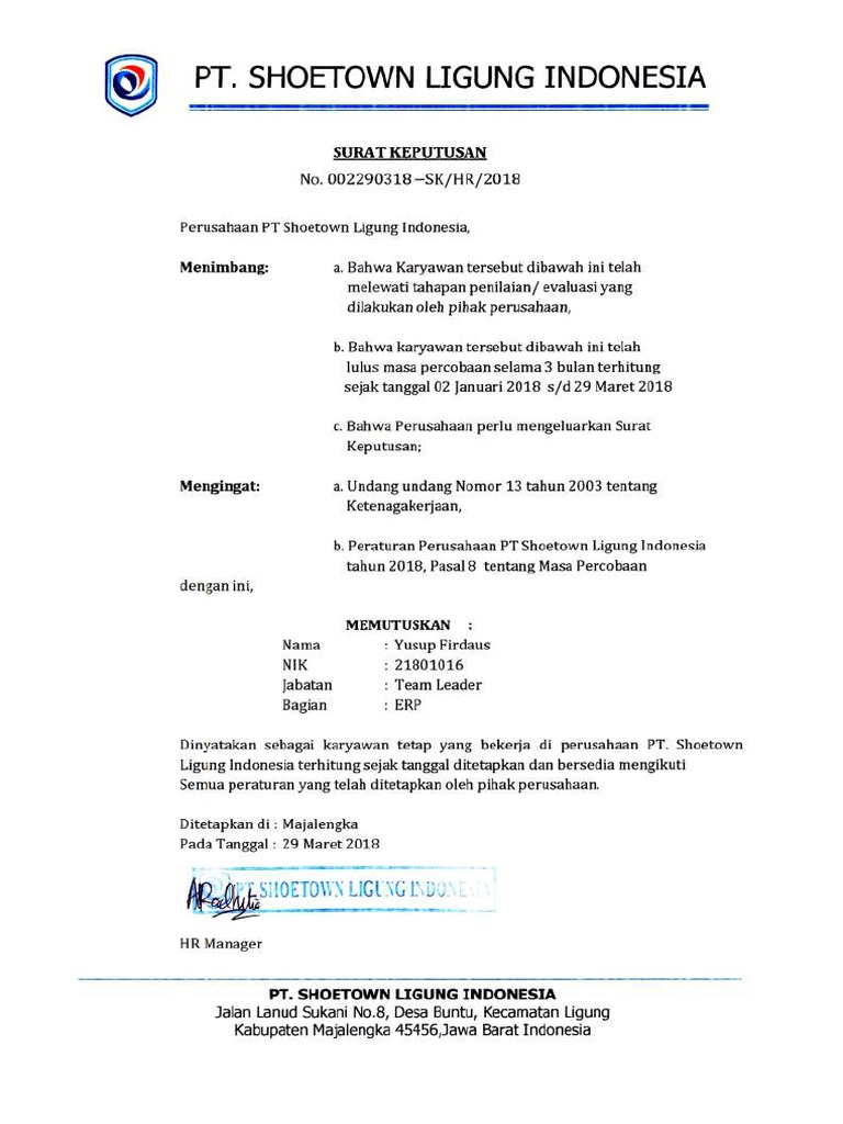 Cukup dengan ada surat keputusan pengangkatan karyawan masa percobaan. Contoh spk pkwtt bagaimana bentuk dan isi dari surat tersebut. Masa percobaan probation period di dalam recruitment kepegawaian sudah lazim adanya masa percobaan bagi karyawan. Biasanya di masa percobaan ini adalah masa masa krusial dan sangat penting bagi karyawan dan perusahaan itu sendiri karena pada masa ini karyawan akan dinilai kelayakannya dalam memenuhi kompetensi yang diperlukan oleh perusahaan tersebut. Artinya adalah bahwa sebenarnya tidak ada kewajiban bagi perusahaan untuk membuat surat perjanjian kerja waktu tidak tertentu. Pihak pihak yang terkait yang tertulis dalam surat biasanya pihak 1 perusahaan dan pihak 2 karyawan.