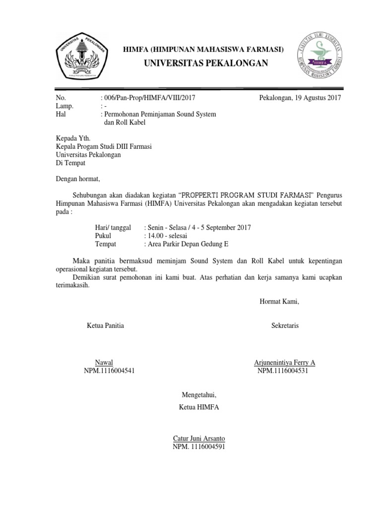 Sebelum menulis tentang contoh surat permohonan izi peminjaman sarana prasana sekolah saya ucapkan selamat tahun baru 2017. 3 seperangkat sound system 4 kursi peserta 300 buah kediri 13 agustus 2015 dewan mahasiswa. Dengan hormat sehubungan akan diadakannya debat. Komunikasi dalam sebuah kelembagaan yang resmi harus dilakukan dengan cara yang resmi juga salah satunya dengan menggunakan surat. Senin 18 november 2019. Contoh contoh surat peminjaman nomor.
