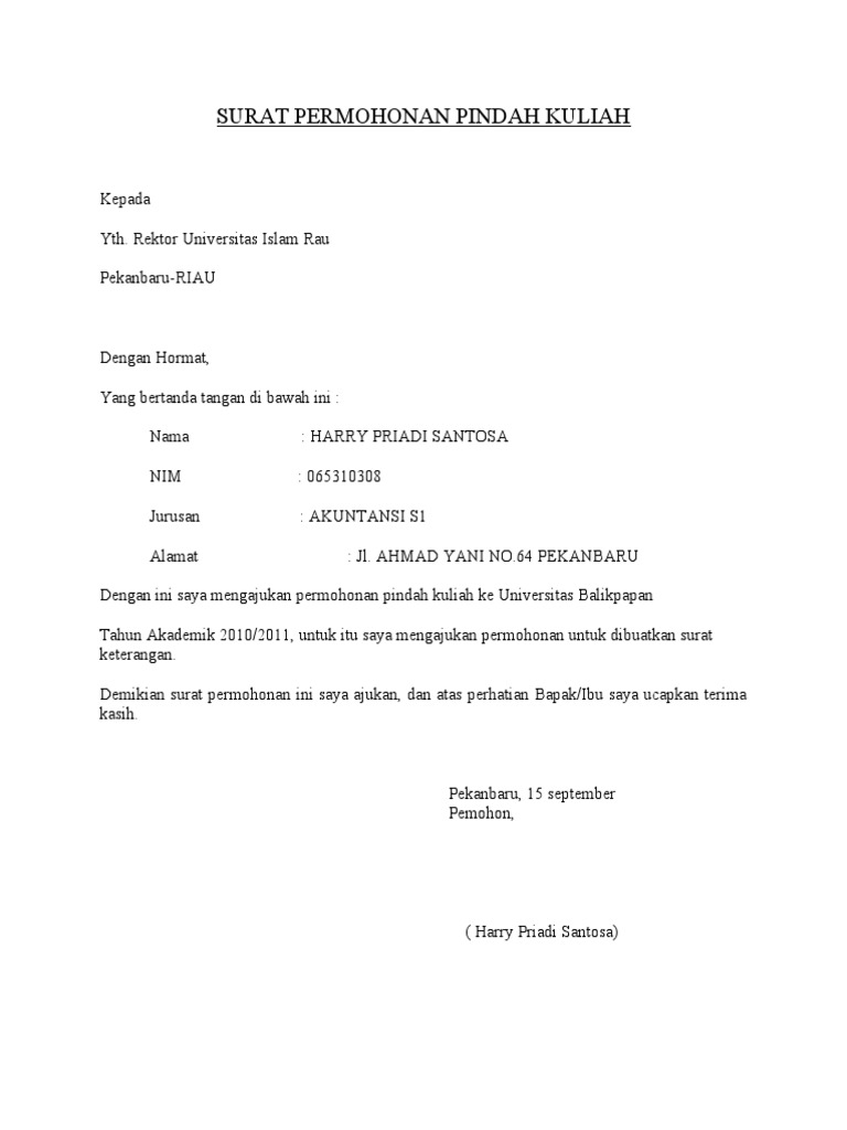 Surat permohonan pindah kuliah. Soebrantas no5 panam pekanbaru dengan ini saya mengajukan permohonan pindah kuliah dari fakultas teknik unri ke salah satu perguruan tinggi di palembang. Surat permohonan pindah kuliah surat lamaran kerja adalah surat yang digunakan untuk melakukan permohonan mendapatkan pekerjaan sesuai pengalaman pada perusahaan tertentu. Surat keterangan bebas tanggungan biaya spp terakhir 3. Wakil rektor bidang akademik.