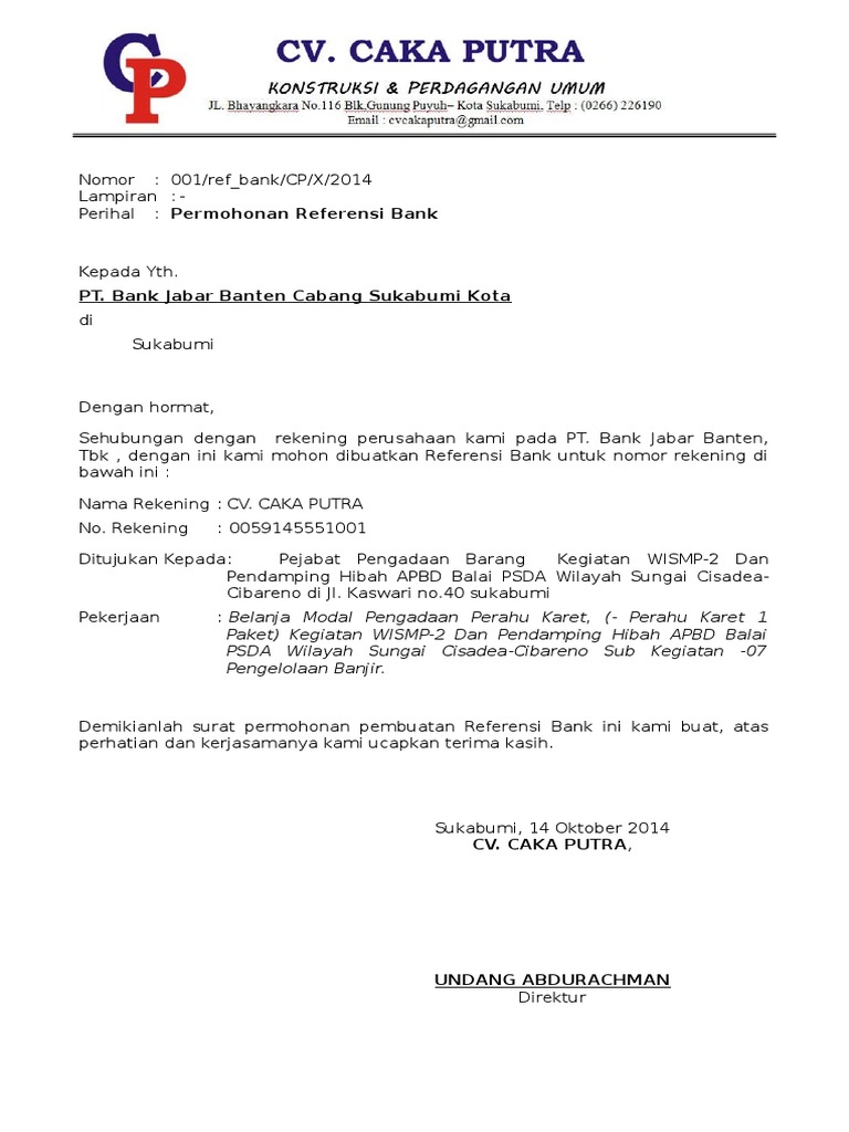 Kop perusahaan surat permohonan referensi bank. 1 juta satu juta rupiah tidak termasuk biaya yang akan dibebankan bank. Contoh surat permohonan referensi bank. Pada umumnya hal ini kita butuh bantuan atau bimbingan orang lain yang berpengalaman dibidang ini dan juga meminta hal hal apasaja yang diperlukan bilamana kita ingin mengurus surat surat terutama surat permohonan ini. Karena tanpa surat permohonan referensi bank ini pihak bank tidak akan menerbitkan surat referensi bank. Surat permohonan adalah surat yang berisi permintaan atau permohonan secara resmi kepada seseorang badan instansi atau perusahaan.