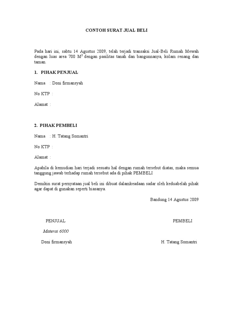 Contoh surat pernyataan jual beli. Kali ini kita akan berikan lebih banyak contoh surat perjanjian jual beli yang baik dan benar. Yang bertanda tangan di bawah ini. 4 contoh surat perjanjian jual beli motor untuk penjual dan pembeli surat perjanjian jual beli motor merupakan surat yang berisi informasi tentang transaksi dan ketentuan ketentuan yang ada di dalam proses transaksi jual beli tersebut seperti menjelaskan objek dan biaya yang dikeluarkan untuk membeli objek yang dijualbelikan. Sukabumi 02 agustus 1970. Contoh surat keterangan jual beli tanah ini bertujuan untuk memberikan panduan atau referensi bagi anda dalam melakukan transaksi jual beli tanah. Surat perjanjian jual beli adalah surat yang dibuat oleh penjual dan pembeli untuk menerangkan atau menjelaskan hak dan kewajiban kedua belah pihak.