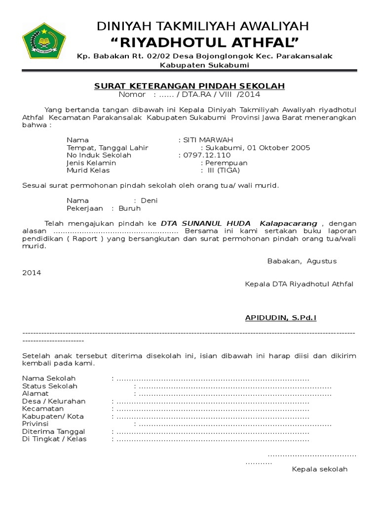 Mengonsep permohonan tentu akan lebih mudah jika menggunakan aplikasi microsoft word. Download contoh surat pindah sekolah doc itu tadi penjelasan singkat tentang contoh surat pindah sekolah dari kami sekian dulu pada kesempatan kali ini kita sambung lain kali dengan penjelasan tentang jenis surat yang lain tentunya. Karena dari sekolah itulah anak anak dapat bisa belajar banyak hal mengenai dunia pendidikan. Yogyakarta 15 februari 2018. Format surat keterangan pindah sekolah disini semoga contoh format surat keterangan pindah seklah tersebut dapat bermanfaat buat sekolah anda dan dapat di gunakan dengan sebaik baiknya serta dapat membantu kelengkapan dokumen sekolah anda. Surat permohonan pindah sekolah merupakan sebuah surat yang dibuat oleh orangtua wali atau siswa untuk memohon kepada pihak sekolah asal agar bersedia memberikan izin atas kepindahan siswa tersebut ke sekolah lain.