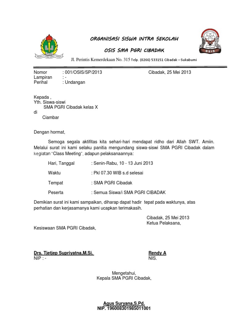 Contoh surat undangan kita tahu surat undangan adalah sebuah tulisan di dalam kertas yang memuat ajakan kepada orang lain baik perorangan maupun kelompok untuk menghadiri kegiatan tertentu. Referensi contoh surat undangan resmi organisai osis sekolah. 022 690210 fax. Nah dibawah ini salah satu surat undangan osis yang baik dan tentunya benar. Saudarai di tempat. Teratai merah muda no.