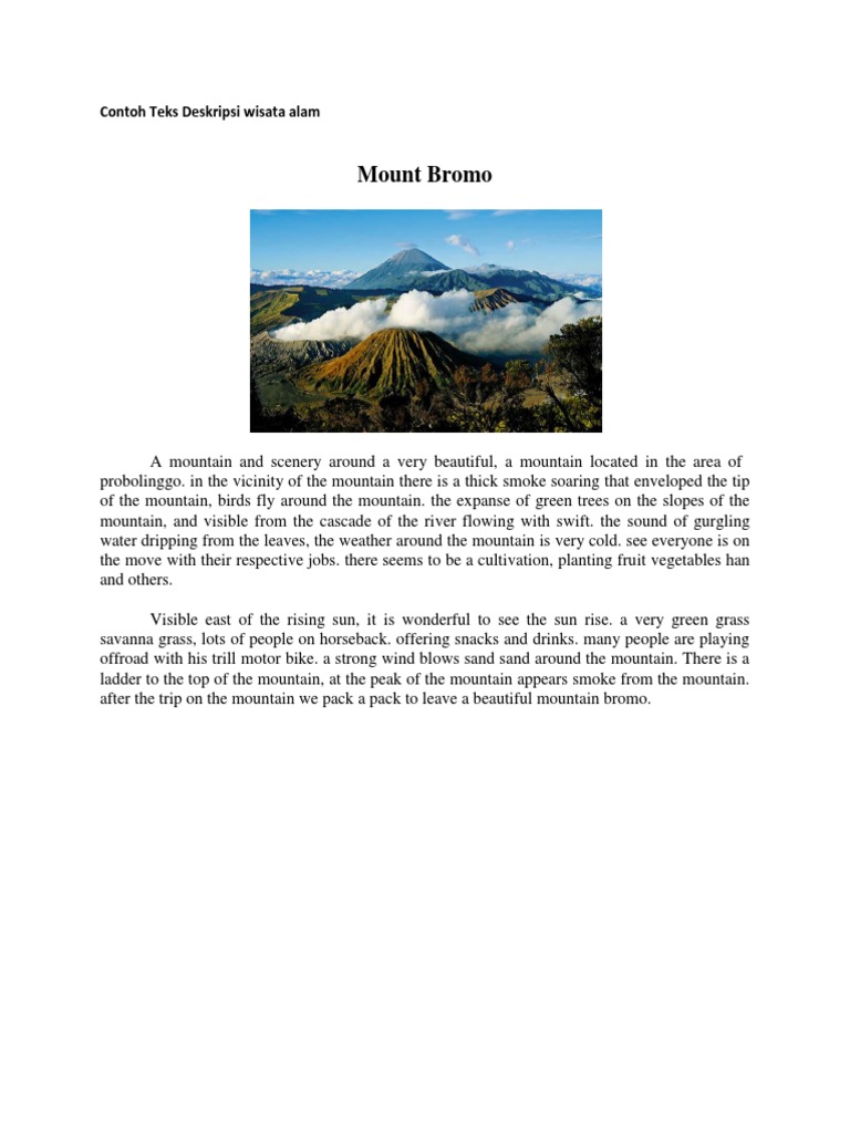 Contoh teks deskripsi tentang alam. Teks deskripsi merupakan sebuah teks atau paragraf yang detail dan jelas berisi tentang gambaran gagasan utama baik. 5 contoh teks deskripsi tentang alam singkat beserta strukturnya written by ivanwira tuesday july 25 2017 add comment yoo para pembaca dan pelajar kali ini saya akan membagikan 5 contoh teks deskripsi singkat tentang alam dan strukturnya yang merupakan salah satu materi pembelajaran bahasa indonesia yang mungkin teman teman butuhkan sebagai referensi untuk mengerjakan tugas. Contoh teks deskripsi terdapat berbagai jenis teks yang sering kita jumpai seperti narasi prosedur eksposisi laporan dan deskripsi. Untuk membuat teks deskripsi yang bagus sebenarnya cukup mudah yakni dengan berlatih setiap hari. Pada saat berada di puncak gunung keinginan yang biasanya muncul adalah keinginan untuk melihat keindahan sunrise. Karena teks deskripsi akan memberikan gambaran secara jelas objek tempat maupun peristiwa yang sedang dibahas.
