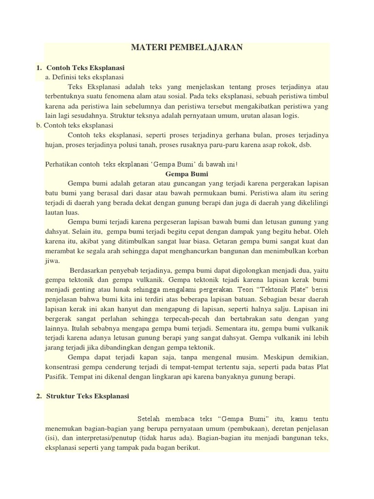 Contoh teks eksplanasi gempa bumi. Contoh teks eksplanasi tentang sosial pengangguran 9. Gempa dikarenakan pergerakan lempeng disebut gempa tektonik dsan gempa karena gunung meletus disebut gempa vulkanik. Contoh teks eksplanasi gempa bumi. Eksplanasi berasal dari bahasa asing inggris yang berarti tindakan menerangkan atau menjelaskan dan keterangan pernyataan atau fakta yang menjelaskan the contemporary english indonesian dictionary. Contoh teks eksplanasi salah satu fenomena alam yang sering dijelaskan secara tertulis menggunakan struktur teks eksplanasi adalah fenomena gempa bumi. Contoh teks eksplanasi tentang benca alam gempa bumi 6.