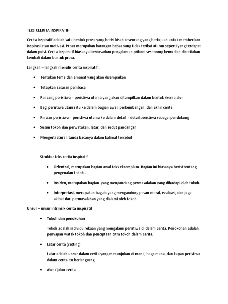 Adapun struktur teks cerita inspiratif adalah sebagai berikut. Contoh teks cerita inspirasi pengertian ciri struktur unsur kaidah dan langkah. Dengan demikian contoh teks inspiratif cocok dibaca bagi anda yang saat ini merasa kehilangan motivasi hidup. Contoh teks inspiratif singkat beserta strukturnya contoh teks inspiratif tentang ibu contoh teks inspiratif tentang persahabatan jiwa besar berkah besar kisah inspiratif cinta. Sungai ciliwung meluap 2 desa terendam banjir setinggi 3 meter. Teks cerita inspiratif teks cerita inspirasional adalah teks yang dirancang untuk memberikan motivasi dan dukungan kepada pembaca apakah itu novel atau peristiwa nyata.