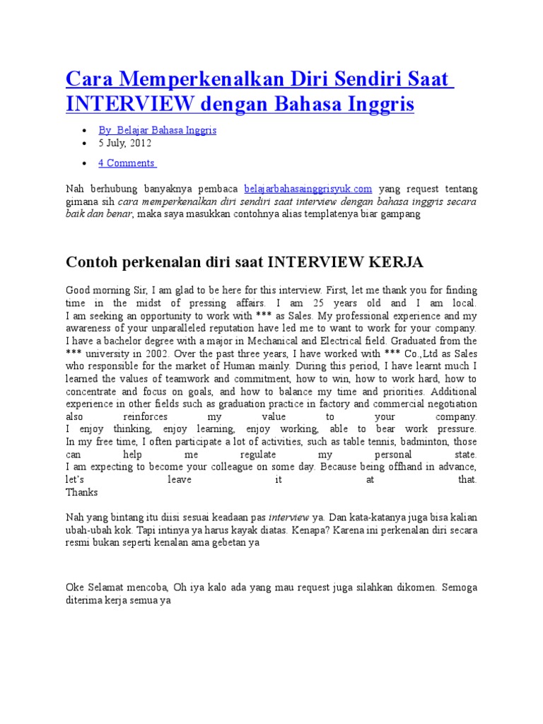 On this occasion allow me to make an introduction to who i am. Mungkin seperti itulah contoh cara perkenalan diri pada saat interview kerja. Hi my name is raditya dharma. Kali ini saya memberikan contoh teks perkenalan diri dalam bahasa inggris. Namun sebelum baca lebih lanjut kamu bisa baca contoh perkenalan bahasa inggris saat interview. Sobat pembaca pada posting kali ini saya akan share contoh percakapan interview wawancara kerja dalam bahasa inggrisinterview atau wawancara kerja dalam bahasa inggris biasa didapat jika perusahaan memberi persyaratan pelamar harus bisa berbahasa inggris atau pelamar sendiri yang menerangkan bahwa ia menguasai bahasa bahasa inggris.