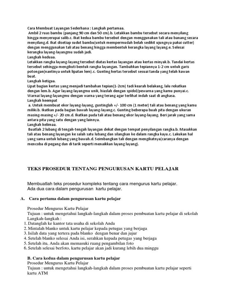 Contoh teks prosedur kompleks membuat kartu pelajar. Kita sering menjumpai contoh teks prosedur kompleks dalam kehidupan sehari hari diantara adalah penggunaan fasilitas umum resep membuat makanan dan lain lain. Contoh contoh teks prosedur dalam artikel ini merupakan contoh tek prosedur dalam bahasa inggris dan bahasa indonesia dengan beragam tema mulai dari cara menanam bunga cara membuat makanan cara membuat kertas daur ulang hingga cara mengurus kartu pelajar. Teks semacam itu sangat penting untuk diketahui khalayak umum agar memudahkan mereka dalam melalui tahapan sesuatu sesuai prosedur dan aturan yang ada. Contoh teks prosedur kompleks dalam kehidupan sehari hari. Penggunaan konjungi yang banyak menjadi ciri kaidah kebahasaan nya. Semoga ulasan dan contoh contoh teks prosedur dalam artikel ini bisa membantumu dalam mengerjakan tugas sekolah tentang teks prosedur.
